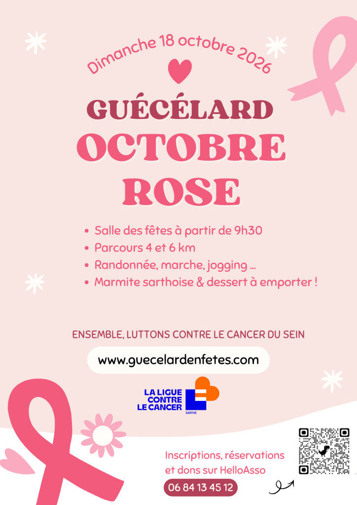 Guécélard deviendra à nouveau COMMUNE ROSE au moins durant tout le mois d’octobre 2026, avec la pose de drapeaux roses sur un côté de la RD 323, la pose de visuels spécifiques « Octobre Rose » confectionnés localement et mis en place sur des zones publiques, l’illumination en rose de bâtiments : mairie, clocher de l’église, maison de la poste…