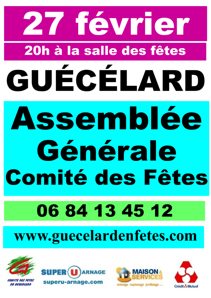 Nous vous convions à l’assemblée générale du Comité des Fêtes qui aura lieu le vendredi 27 février à 20h à la salle des fêtes.