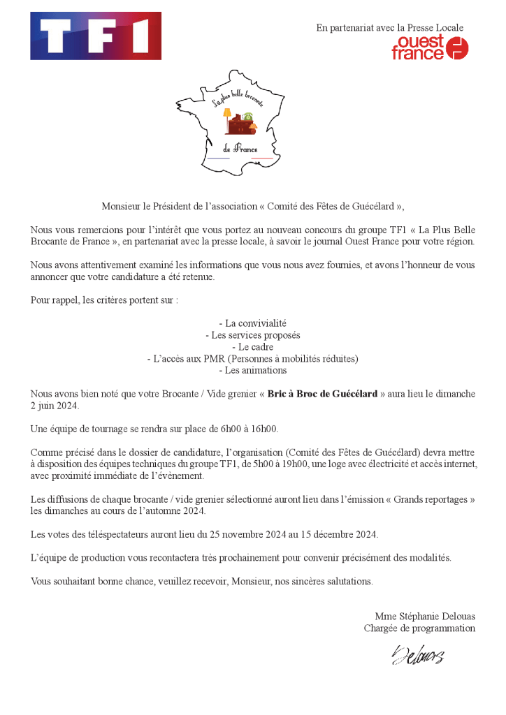 1er avril 2024 : Une bonne nouvelle : un communiqué publié sur facebook qui fait suite au courrier reçu de TF1 !