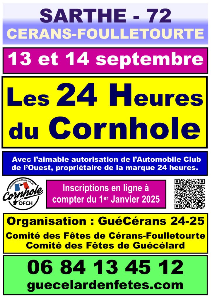 Pour notre part, nous avons déclaré deux SPOTS (endroit où l’on joue) sur le site de l’OFCH, un à Guécélard et le second à Cérans Foulletourte où se déroulent, depuis 2025, les 24 Heures du Cornhole (avec l’aimable autorisation de l’ACO).