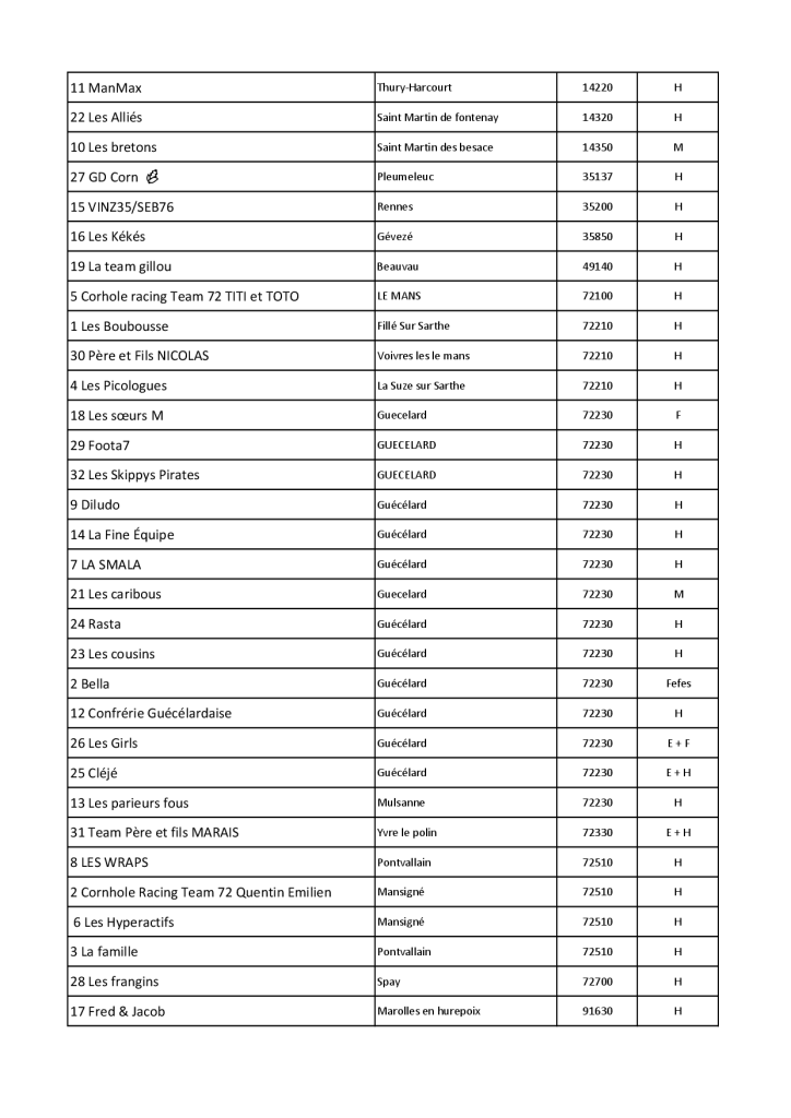 Pour notre part, nous avons déclaré deux SPOTS (endroit où l’on joue) sur le site de l’OFCH, un à Guécélard et le second à Cérans Foulletourte où se déroulent, depuis 2025, les 24 Heures du Cornhole (avec l’aimable autorisation de l’ACO).