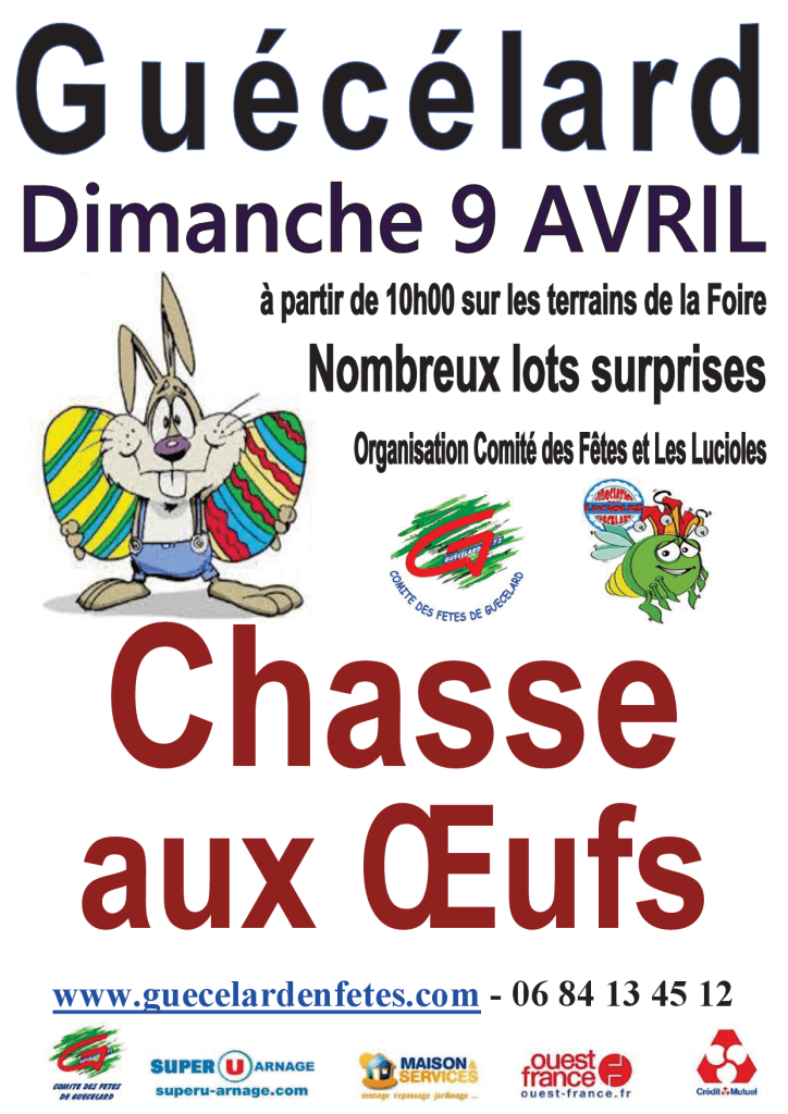 Nouveauté : Une chasse aux œufs sera organisée le dimanche 9 avril de 10h à 12h sur les terrains de la Foire (terrain principal et terrain de boules…), route des Galopières, à Guécélard.