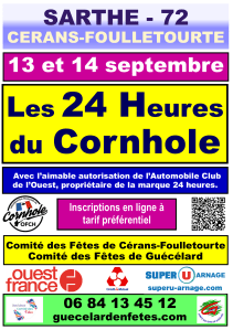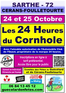 Après la première édition des 24 Heures du Cornhole qui se sont déroulés les 13 et 14 septembre 2025, les Comités des Fêtes de Cérans et Guécélard récidivent et ont programmé la seconde édition les 23 et 24 octobre à la salle des Fêtes de Cérans Foulletourte !
